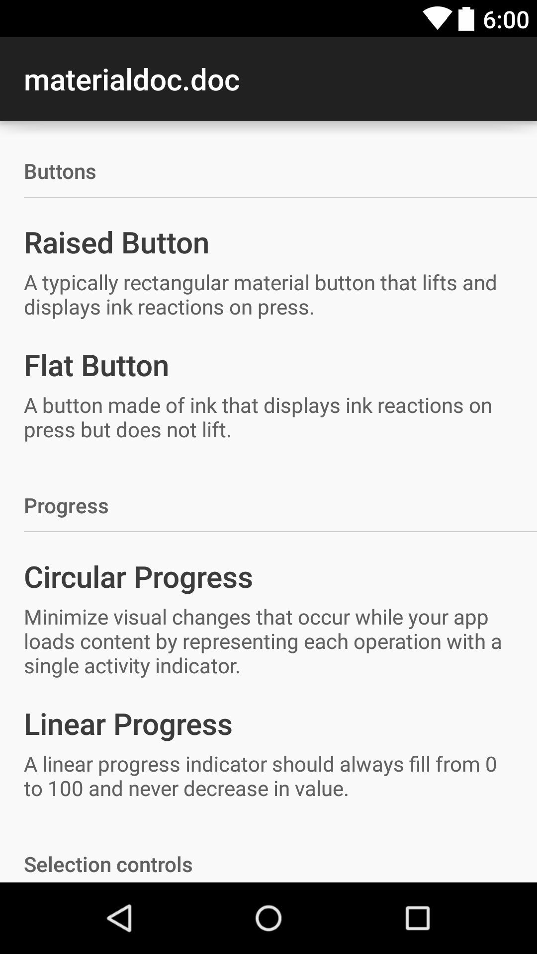 I am happy to announce that we just released open source Android application which includes all source code (layouts, styles, colors) of materialdoc.cn tutorials.