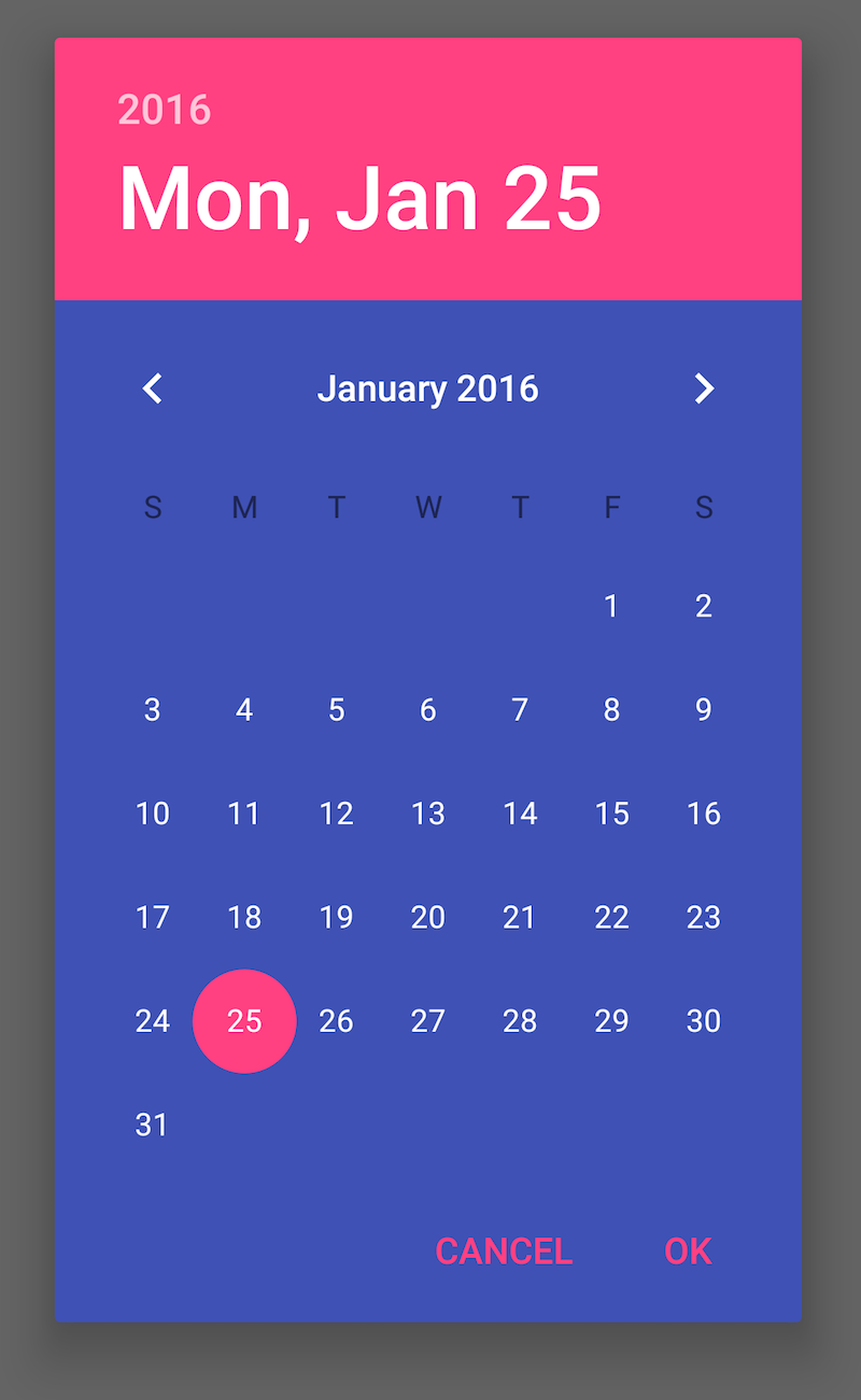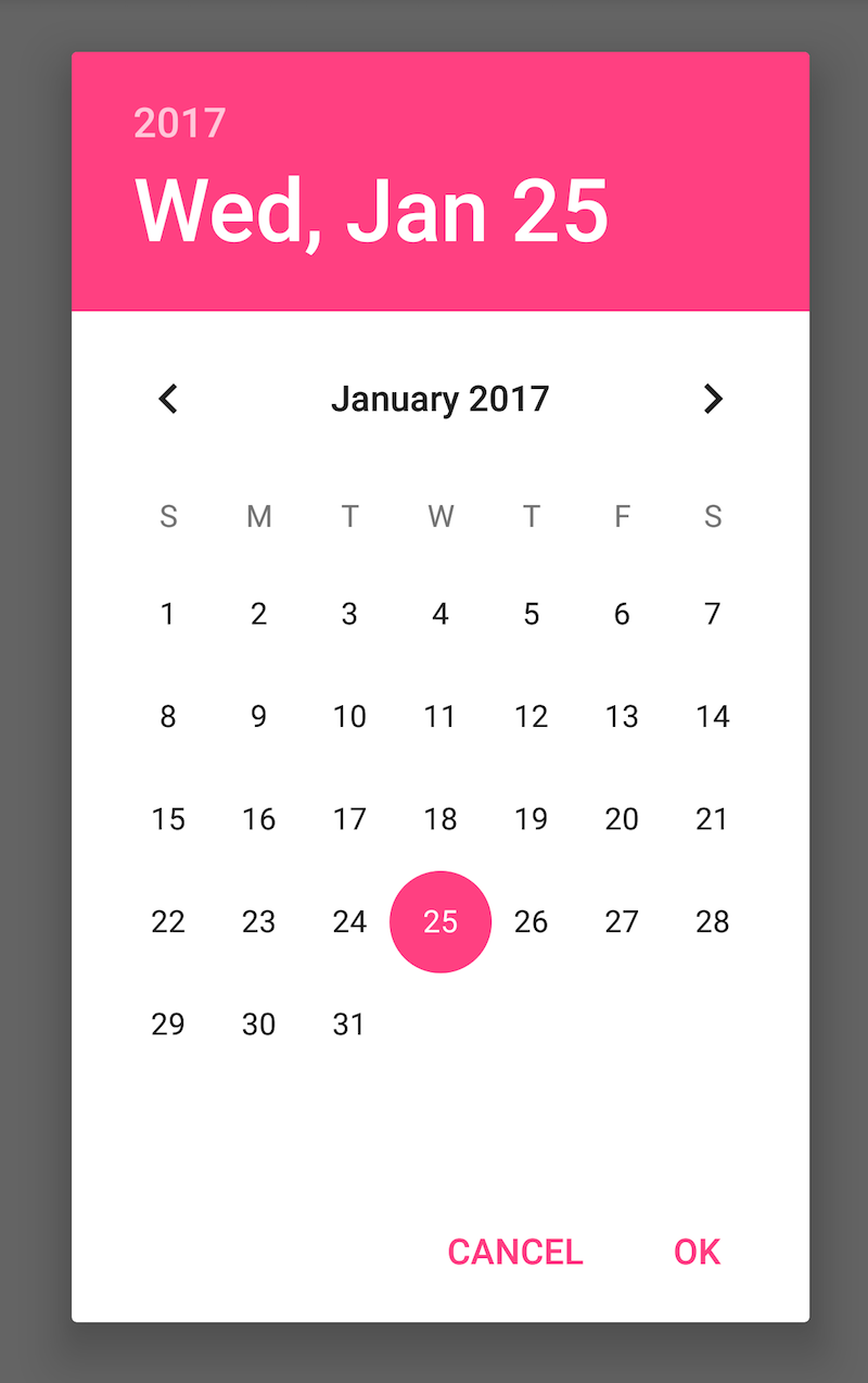 对话框选择器用来在手机上选择日期。 被选中的一天,用与其他日期不同的颜色和着重类型的实心圆来表示。